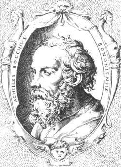 Achille Bocchi (Achilles Bocchius) (1488 – 6 November 1562), of Bologna, was an Italian humanist writer, emblematist, historian and lector in Greek, poetry and "humanae litterae" at the University of Bologna.[1] He is best known for his emblem book Symbolicarum quaestionum de universo genere from 1555, which "takes as its subject the whole of universal knowledge: physics, metaphysics, theology, dialectic, Love, Life and Death, packaging them under the veil of fables and myths."[2] It borrowed from Francesco Colonna.[3] The title page put it in the tradition of serio ludere.[4] Bocchi was a friend of Giovanni Pierio Valeriano Bolzanio, and his work is related to Valeriano's Hieroglyphica.