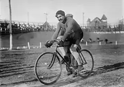 Germain made his return to the road at the end of September with Paris–Tours. His eighteenth-place finish was anecdotal, just as his last few outings on the track were hardly conclusive: he failed twice in his attempt to set the record for the hour without a trainer at La Flèche.[24] In early December, however, he was selected for the Six Days of New York, one of the world's most famous races, where he teamed up with British runner Reginald Shirley. In the 50th minute of the race, Shirley caused a heavy crash when he passed the baton to Germain, who was hit in the right leg. The duo conceded a lap to the other teams, and despite Germain's best efforts, were unable to catch up. At the end of the first day of racing, Shirley retired, suffering from stomach pains. Germain was joined by the Italian Egisto Carapezzi, whose partner had also been forced to withdraw. By the regulations, the new crew received a one-lap penalty, but this was nothing compared to the number of laps Carapezzi regularly conceded during his stints. The duo were 21 laps down after 34 hours of racing. Redoubling their efforts to overcome the deficit, the two men suffered a breakdown at the same time and interrupted their race for two hours. At the end of the fifth day, Carapezzi gave up, and despite Germain's desire to continue the race, the judges deemed him too retarded to continue, his deficit having risen to almost 900 laps.[25]