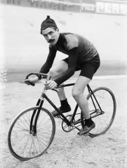 During the winter of 1905–1906, Germain trained alongside the best specialists of the day on the Vélodrome d'Hiver track in Paris. Though he could see the gap existing between him and those in the lead, Germain's persistence in training was noticed. Along with Georges Parent, he was chosen to join the coaching team of Henri Cornet, winner of the 1904 Tour de France, in a 50-kilometer tandem match[notes 1] against Karl Ingold. Cornet won by nine laps. At the same meeting, Germain made his mark as an individual in the 15-kilometer race behind motorcycles. Third behind Paul Rugère and Anton Jaeck, his offensive behavior throughout the race was praised by the spectators.[7] On February 18, he teamed up with Denmark's Axel Hansen in the American-style Twelve Hours race, in which the two competitors took turns at will. At the end of the race, fourteen teams were still classified in the same lap: victory was therefore decided over six laps between the best sprinters in each team. Hansen initially placed fourth, but the commissaries were slow to validate the results after a crash on the last lap. The race was eventually canceled.[7] On March 4, a meeting was held at the La Flèche Velodrome, bringing together several well-known riders. On his home turf, Germain took third place in the bonus race behind Charles Vanoni and Victor Thuau, before losing out to César Simar, Olympic medalist two years earlier, in the 10-kilometer race behind the bike.[8]