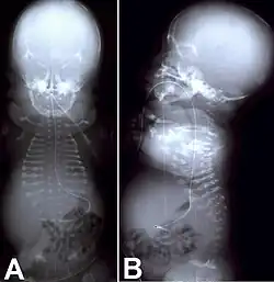 | Postmortem anteroposterior (A) and lateral (B) whole-body radiographs of the baby. | |
