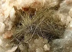 The term "acicular" derives from the Late Latin "acicula" meaning "little needle".[1] Strictly speaking, the word refers to a growth habit that is slender and tapering to a point. Prismatic crystals are not acicular; however, colloquial usage has altered the commonly understood meaning of the word. When writing for mineralogical publications, authors should restrict their usage of "acicular" to crystals with the tapering growth habit.