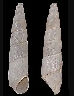 The elongated, turreted shell has a uniform white color. The spire is composed of eight whorls, separated by a closely channeled suture. The protoconch is embryonic, smooth and convex. The two following whorls are also convex, but decorated with striae slightly decurrent. The others are less convex adorned with more pronounced decurrent striae. They show, below the suture, a quite acute projecting keel, that extends around the base of the body whorl. The aperture is oval, angular at the top. The columella is arcuate, surrounded by a callous bead, acuminate at the base.[2]