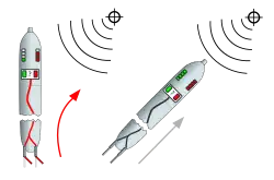 Acoustic homing torpedoes are equipped with a pattern of acoustic transducers on the nose of the weapon. By a process of phase delaying the signals from these transducers a series of "acoustic beams" (i.e. a variation of acoustic signal sensitivity dependent on the incident angle of the noise energy). In early homing torpedoes the "beam patterns" were fixed whereas in more modern weapons the patterns were modifiable under on-board computer control. These sensor systems are capable of either detecting sound originating from the target itself i.e. engine and machinery noise, propeller cavitation, etc., known as passive sonar, or responding to noise energy reflections as a result of "illuminating" the target with sonar pulses, known as active sonar. Acoustic torpedoes can be compared to modern fire-and-forget guided missiles. What this means is the enemy (most likely a submarine) will be detected by sonar in any direction it goes. The torpedo will start with passive sonar, simply trying to detect the submarine. Once the torpedo's passive sonar has detected something, it will switch over to an active sonar and will begin to track the target. At this point, the submarine has probably started evasive maneuvers and may have even deployed a noisemaker. The torpedo's logic circuitry, if not fooled by the noise maker, will home in on the noise signature of the target submarine.