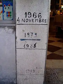 Another noteworthy acqua alta took place on November 5, 1686. Several chronicles of the time, among them one written by a scientist, concur in reporting that "the waters reached the outdoor floor of ... [Sansovino's] Lodge", which is the monumental entrance to the Campanile di San Marco. A similar level was reached during the exceptional flood of November 4, 1966, which allowed scholars in the late 1960s to recreate a likely scenario for the 1686 flood. After accounting for the rebuilding of the Lodge after the 1902 fall of the Campanile and for subsidence, estimates concluded that the tide may have been as high as 254 cm above today's standard sea level.[15]