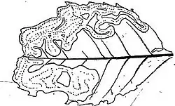 The larvae feed on Pseudopanax arboreus and Raukaua simplex.[5] They mine the leaves of their host plant. The mine is entirely on the under-surface of the leaf. Throughout its whole course it is a simple gallery, and very tortuous in its direction. The chief direction is in the long axis of the leaf, and the outer portions of the leaf are more mined than the centre. The gallery twists and turns, and in its course follows so close against the earlier portions that the partition between them is broken down, and finally the entire mine appears to form a huge blotch occupying about one half the leaf-surface. Though thus closely following its former track, it rarely crosses it except under direct need. The midrib forms a barrier, except in its upper and thinner part, where it is invariably crossed. The colour in the early stages of the mine is white with a fine brown central line occupied by the frass. The remainder of the mine is a shade paler green than the rest of the leaf.[1]