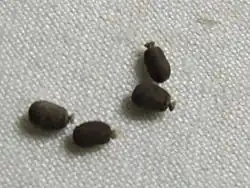 The females then flick their eggs to the ground. The eggs look similar to those of the Children's stick insect (Tropidoderus childrenii) but they are black-grey with a small white growth. Ants pick them up and eat the growth, and leave the egg in the refinery where they hatch.