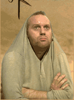 Eventually it looks as if he's given up and he sits on the big cube. After a while, this is pulled up from beneath him, and he is left on the ground. From this point on he refuses to ‘play the game’ any further; even when the carafe of water is dangled in front of his face he does not make to grab it. The palms for the tree open, providing shade once more, but he doesn’t move. He simply sits there in the dazzling light looking at his hands.
