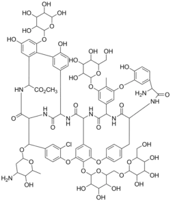 Actaplanin is a complex of broad-spectrum antibiotics made by Actinoplanes bacteria.[1][2] Research carried out by a group in Eli Lilly and Co. in 1984 identified several actaplanins using high-performance liquid chromatography.[3][4][5] Actaplanins A, B1, B2, B3, C1 and G were shown to be composed of the same peptide core, an amino sugar, and varying amounts of glucose, mannose, and rhamnose.[6]
