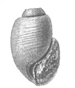 (Original description) The longitudinally subovate shell has a very short, obtuse spire. The imperfection of the specimen makes the number of whorls undeterminable. The whorls are gently convex and constitute the greater bulk of the specimen. The aperture is elongate elliptical and fully three times as long as wide. It is rounded below and acute above. The columella apparently contains two folds, both of which are rather obscure and seen only as slight impressions on the surface of the columellar cavity and are situated quite high. The surface is marked by rather fine, spiral lines, coarser on the lower part than above and the surface of the cast is marked by a rather broad depressed spiral band or groove, a little below the suture. Indications of transverse lines of growth are extremely faint. [2]