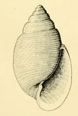 (Original description) The large shel lis ovate-acuminate, rather thin and with an acute spire. The shell contains seven round-shouldered whorls, parted by channelled sutures. The surface is smooth and glossy. The colour of the shell is a pale flesh-pink, darkest behind the aperture, interrupted by a broad white peripheral band.