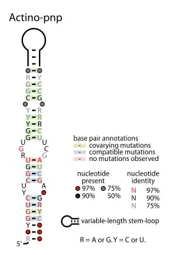 The Actino-pnp RNA motif is a conserved structure found in Actinomycetota that is apparently in the 5' untranslated regions of genes predicted to encode exoribonucleases.[1] The RNA element's function is likely analogous to an RNA structure found upstream of polynucleotide phosphorylase genes in E. coli and related enterobacteria.[2] In this latter system, the polynucleotide phosphorlyase gene regulates its own expression levels by a feedback mechanism that involves its activity upon the RNA structure. However, the E. coli RNA appears to be structurally unrelated to the Actino-pnp motif.