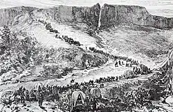 The NNC became pinned down, but Hamilton-Browne led one company to assault the Zulus in the rough ground.[4][33] The assault was successful in clearing the base of the gorge, and capturing a number of women and children, who were sent to the rear. The Zulu warriors retreated up a steep path leading to the top of the cliffs.[33]