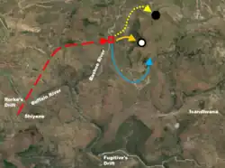 Sihayo and his senior son, Mehlokazulu, missed the action, having left the day before with the bulk of his fighting men to answer Cetshwayo's call to arms at Ulundi.[24][4] He had left just 200 to 300 men to defend his kraal.[49] News of the attack reached the Zulu king whilst he was considering which of the three British columns to engage with his main force. The action seems to have convinced him to order an attack on the Centre Column.[42] Cetshwayo may have been persuaded that the Centre Column was the most important of the British forces by the presence of Chelmsford directing the attack.[50] Cetshwayo sent the bulk of his army against it and part of Chelmsford's force was subsequently annihilated at the Battle of Isandlwana on 22 January.[42] The prisoners released by Chelmsford on 13 January may have helped the inhabitants of Sotondose's Drift attack British survivors of the battle.[44] The survivors of Sihayo's kraal were certainly present, harassing the fleeing men and killing stragglers.[51] The dead included Lieutenants Teignmouth Melvill and Nevill Coghill who were killed while trying to save the Queen's colour of the 1/24th and the drift afterwards became known as Fugitive's Drift.[44]