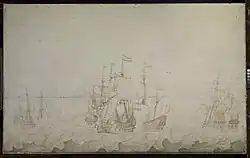 ![]() The naval battle against the Spaniards near Dunkerque, 18 february 1639. Oil and ink on canvas by Willem van de Velde the Elder. | |||||||