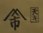 The print displays two publisher seals. On the right is the mark of Kinkadō (金華堂) or Tenmaya Kihei (天満屋喜兵衛), commonly known as Tenki (天喜/天キ). The firm operated in Osaka from 1816 into the 1850s,[7] and published works by Gigadō Ashiyuki, Konishi Hirosada, Shunbaisai Hokuei, Sadamasu and Ryusai Shigeharu among others.[8] Tenki used various hanmoto (版元) publisher seals. This version features the kanji character 天 (ten) followed by the katakana character キ (ki) within a rectangle.