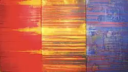 Tery Fugate-Wilcox, uses water-soluble paint & rain to make ever-changing painting on canvas; "RYB" by Tery Fugate-Wilcox, vegetable pigments & rain on canvas, 48" x 60"