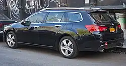 The Acura TSX Sport Wagon is a badge-engineered version of the CW-series Honda Accord Tourer station wagon.[29] The Sport Wagon was unveiled in the 2010 New York Auto Show.[30] The TSX Sport Wagon is mechanically identical to the TSX sedan, sharing the 201-horsepower Honda K engine 2.4L DOHC inline four-cylinder engine, Sequential SportShift 5-speed automatic transmission, and four-wheel independent sports suspension. Unlike the sedan, the Sport Wagon is not offered with the 6-speed manual transmission nor the V6 engine.[31][32] The Sport Wagon offers 60.5 cu-ft of rear cargo area (with rear seats folded down; 25.8 cu-ft with the seats up), rear seats with 60/40 fold-down design.