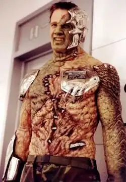 When he auditioned, Hertzberg had no idea what Adam would look like in full costume and make-up. Buffy used a company named Optic Nerve to build the materials to make Hertzberg look like a demonoid. Almost immediately after Hertzberg got the part, Optic Nerve sketched and sculpted Adam's appearance. They had Hertzberg come in to have molds made for prosthetic parts to fit his head and face, arms, chest, and legs, then he was fitted for contact lenses. They also created separate hands and a chest to film for close-up shots. Adam has a floppy disk drive mounted on his chest which, when used, had to be filmed without Hertzberg behind it. The entire construction of Adam's appearance took about two weeks.[28] Hertzberg's voice was also modified post-production. When he saw the full Adam prosthetic and costume, his biggest concern was being able to show nuanced facial expressions under so much latex. It took hours to get Hertzberg into his full costume, but even after it was fully applied on set, often he would have to wait even longer before he went in front of the cameras. He spoke of the need to stay focused during all the waiting while sweating underneath everything he wore for the part.[29]