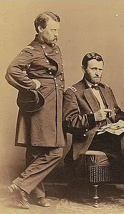 In 1862, Badeau joined the Union Army during the American Civil War and was commissioned as a captain.[2] As a member of the staff of Thomas W. Sherman,[a] he took part in the Siege of Corinth, Mississippi, the defense of New Orleans, and the Siege of Port Hudson.[10][11] where he was severely wounded.[12] After his recovery, in March 1864, on the personal recommendation of Grant's adjutant, General John A. Rawlins,[13] Badeau joined the staff of Ulysses S. Grant as a brevet lieutenant colonel and military secretary. During this time Badeau and Grant became close friends.[10][13] Badeau took part in the Wilderness and Appomattox campaigns, and received promotion to brevet colonel.[14] He remained on Grant's staff until 1869, and left the Army for disability caused by his Port Hudson wound; he held the permanent rank of captain and the brevet rank of brigadier general.[10]