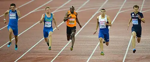 On 31 May 2015, he broke the 10-second barrier in the 100 m for the first time in his career, with a run of 9.97 seconds; however, the wind speed (+3.7 m/s) was above the legal wind limit.[22] Two months later, on 7 July at the Diamond League meeting in Birmingham, he became the 100th man in history to break the 10-second barrier legally, again clocking 9.97 seconds (+2.0 m/s); however, he fell as he crossed the line, picking up a hamstring injury which would cause him to miss the 2015 World Championships.[23][5][24]