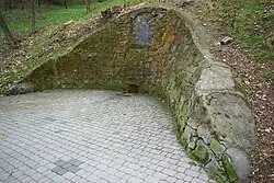 - Historic waterworks building from the 1930s, including a pumping station from the early 20th century (eastern slope). It includes a retention reservoir for the municipal water system, which was designed by engineer Otto Nadolski in 1934.[29] During the tenure of Mayor Jan Rajchel (1881–1937), construction began in February 1934 and was completed with the commissioning of the municipal waterworks on 24/25 June 1936. The water intake was installed in Trepcza, and the reservoir tank was built in the city park.[52] By the late 1930s, the front façade of the building bore the inscription "Sanok Water Reservoir".[53] In September 2012, the building's exterior was repainted.[54] Two commemorative plaques are mounted on the façade of the building, which was repainted in 2012: