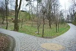 The park's establishment was spearheaded by August Ścibor-Rylski, who personally planted the first trees.[5] On 25 August 1900, he guided Leon Piniński, the Galician Governor, through the park.[6] In 1898, the Sanok City Council named the park and the adjacent eastern street after Adam Mickiewicz to mark the centenary of his birth.[7][8] That same year, a small Adam Mickiewicz Mound was created by local high school students on the hill's summit, later expanded significantly. In 1905, a committee purchased adjacent land from Ms. Tebinkowa to enlarge the mound.[9] Work continued from 27 September 1905, with voluntary participation from residents and students,[10] until 1910.[11][12] A commemorative stone was placed to honour Mickiewicz's centenary. The park was developed on the hill's slopes.[13]