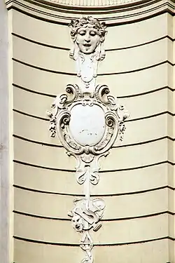 A five-story building of a cubic capacity of 16,944 m3 (598,400 cu ft) designed for 770 seats, constructed in the style of late Viennese Baroque. The façade is distinguished by a seven axes main façade with a triangle projection. Vertical divisions of the façade are emphasized by flat listens. A ledge, in its projection part, is finished by a pediment with a “kidney window” and a bas-relief in the shape of leaves, tree branches and decorative motives in rocaille style. Over the window, there is an attribute of Apollo - a bas-relief in the shape of a lire braided with a twig.[5]