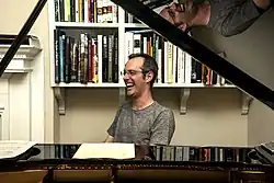 ![]() Adam Seelig in August 2014 at a piano, smiling while surrounded by books in his home library | |