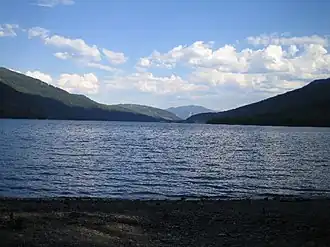 The lake divides the upper and lower parts of the Adams River.[18] A main channel and a series of smaller channels of the river enter the lake through a narrow, curved, steep-sided valley.[19] These steep slopes become gentler toward the southern end.[20] Other significant tributaries are the Momich River and Bush Creek.[15]