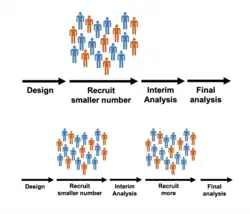 | Group sequential | Sample size, by a set interval at a time. | Sample sizes can be changed. These trials usually change the sample size by adding or removing set-blocks of patients such as adding 20 patients at a time, and then re-evaluating. This type of design is explained in detail on PANDA.[6] |