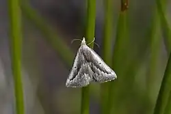 The forewings of A. griseata are silver grey in colour with a small disk-shaped dot as well as with dark brown or blackish triangular shaped shading from the middle of the base of the forewing to its apex and a much smaller brown triangular shaped shading below this. The hind-wings are grey coloured tinged with yellow brown.[7] When at rest its body position tends to be head downward.[8] Hudson regarded this species as being extremely variable in the intensity of its markings and the depth of its colouring.[7]