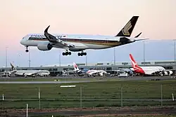 ![]() Singapore Airlines Airbus A350-900 landing in front of the main terminal (Qatar Airways, Malaysia Airlines, and Qantas aircraft in background) | |||||||||||||||