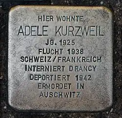 A history teacher at the Montauban Lycée Michelet initiated a project focusing on the topics of Holocaust and persecution of minorities in 1994. Her students created an exhibition about Adele Kurzweil and eventually got the schoolyard named after the girl. They received the Sorbonne's Prix Corrin for their achievement.[11] The students subsequently cooperated with colleagues in Graz which led to another project in Adele's hometown including archive research plus conversations with Holocaust survivors. The result was an exhibition in the Graz synagogue that was established in November 2001 and became so popular that it was exported to several locations all over Austria.[12][13]