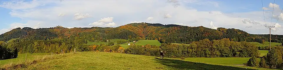 View from NE slope of the Laubenberg across the Eistobel valley and municipality of Maierhöfen looking NE towards the Adelegg | |