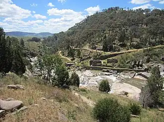 The Falls themselves are situated on Adelong Creek, 1 kilometre (0.62 mi) north of Adelong. At this point, the creek passes through a narrow gorge about 300 metres (980 ft) long and drops about 30 metres (98 ft) in height over that distance.[5]: 7 It is here that the remains of the Wilson and Ritchie Battery are located, about 200 metres (660 ft) along the cascades. Archaeological investigations in 1985, showed that the Battery ruins are part of a larger, dynamically accrued complex of remains that extend past the boundary of the Adelong Falls Reserve.[1]