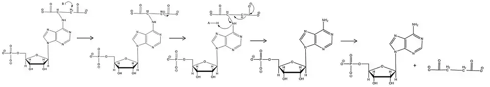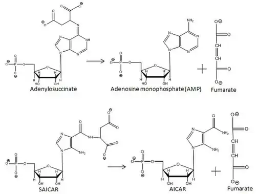 Adenylosuccinate lyase (ASL) is an enzyme that catalyzes two reactions in the de novo purine biosynthetic pathway. In both reactions it uses an E1cb elimination reaction mechanism to cleave fumarate off of the substrate. In the first reaction, ASL converts 5-aminoimidazole- (N-succinylocarboxamide) ribotide (SAICAR) to 5-aminoimidazole-4-carboxamide ribotide (AICAR) and fumarate. AICAR proceeds through three more reactions before it becomes adenylosuccinate (also called succinyladenosine monophosphate or SAMP), which ASL then splits into adenosine monophosphate (AMP) and fumarate.[8] ASL is important to cells not only because of its involvement in creating purines needed for cellular replication, but also because it helps regulate metabolic processes by controlling the levels of AMP and fumarate in the cell.[9]