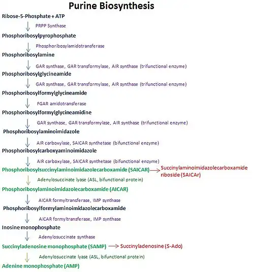 This flow chart shows the steps in the biosynthesis of AMP.Steps in green show steps catalyzed by ASL Steps in red show the dephosphorylation of ASL's substrates