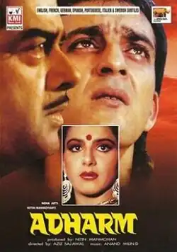 Adharm (transl. : Unrighteousness) is a 1992 Bollywood action drama film directed by Aziz Sejawal and produced by Nitin Manmohan. The film stars an ensemble cast. The story was written by Javed Siddiqui.[1] The Film was hit at box-office.The song "Tuna Tuna" was huge hit and contributed to the success of the film