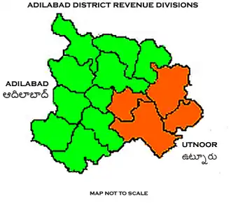 The district is divided into two revenue divisions, Adilabad and Utnoor. These two divisions are sub-divided into 19 mandals.[3] Sri Rajarshi Shah is the current revenue District Collector for the District.[18]