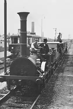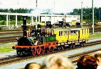 To celebrate the centenary of the railways in Germany in 1935, a replica of the Adler was built beginning from 1933 by the Deutsche Reichsbahn in the Kaiserslautern repair shop (Ausbesserungswerk), which was largely true to the original. The original idea of the President of the Reichsbahn Julius Dorpmüller and the members of his staff was to use the Adler-replica as an instrument of propaganda for the "new era" in the city of the Reichsparteitag Nuremberg. They planned to contrast the Adler with modern gigantic steam locomotives like the high-speed DRG Class 05. For the realisation of the replica they used the results of the planning in 1925. Besides of different technical data the replica differed from the original with thicker boiler casing and additional cross bracings and spokes wheels made of steel.[12] The replica attained an average speed of 33.7 km/h in tests on an 81 kilometre stretch of line. The route had gradients of between 1:110 and 1:140. From 14 July until 13 October 1935, visitors could travel with the reconstructed Adler-train on a track length of two kilometres on the area of the centenary exhibition in Nuremberg. On the driving cab were also the President of the Deutsche Reichsbahn Julius Dorpmüller and the Gauleiter of Franconia Julius Streicher. The Adler-replica was in use after that in 1936 at the Cannstatter Wasen in Stuttgart and during the 1936 Summer Olympics in Berlin. During the 100-years-jubilee of the first Prussian railway in 1938 the Adler-train was in service between Berlin and Potsdam. After this event the Adler-train was sent to the Nuremberg Transport Museum.