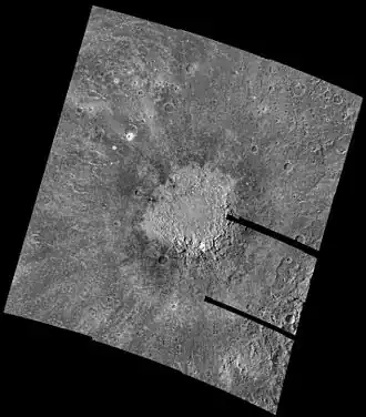 The relatively young, large Lofn impact crater is superposed on Adlinda.[1] The bright deposits from this crater cover about 30% of the surface of Adlinda hindering detailed study. Lofn is an example of a flat floored impact crater.