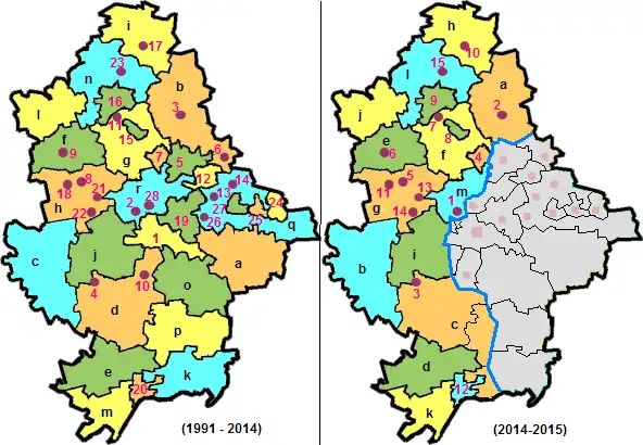 Until 2020, Donetsk Oblast was subdivided into 46 regions: 18 districts (raions) and 28 city municipalities (mis'krada or misto), officially known as "territories governed by city councils".[3][4] In 2014, the War in Donbas started, and whereas some areas are controlled by the central Ukrainian government, others are under control of separatists representing Donetsk People's Republic. The pro-Ukrainian government of the oblast was relocated from Donetsk to Mariupol.
