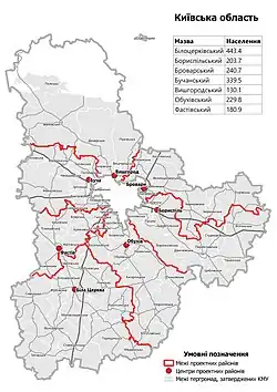 - Obukhiv (Обухівський район), the center is in the town of Obukhiv;