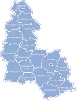 Before 2020, Sumy Oblast was subdivided into 24 regions: 17 districts (raions) and 7 city municipalities (mis'krada or misto), officially known as territories governed by city councils.[3]