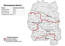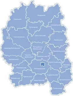 - Zhytomyr (Житомирський район), the center is in the city of Zhytomyr;