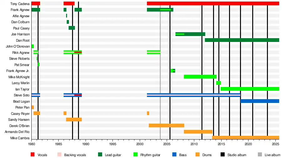 During the 1980s the band went through several lineup changes, breakups, and reunions, most involving drummer Casey Royer and guitarist brothers Rikk, Frank, and Alfie Agnew. During that decade, they released three albums: Adolescents (1981), Brats in Battalions (1987), and Balboa Fun*Zone (1988, without Reflex), then broke up in April 1989. Most of the members remained active in other musical projects, and a reunion of most of the early members in 2001 resulted in the comeback album OC Confidential (2005). Soto and Reflex have been the band's only constant members and primary songwriters since then, anchoring lineups that have released five more studio albums: The Fastest Kid Alive (2011), Presumed Insolent (2013), La Vendetta... (2014), Manifest Density (2016) and Cropduster (2018). On June 27, 2018, Soto died at the age of 54, leaving Reflex as the only original founding member. Brad Logan replaced Soto and the band's tenth album, Russian Spider Dump, was released in October 2020. The band released their eleventh album, Caesar Salad Days, in July 2023.