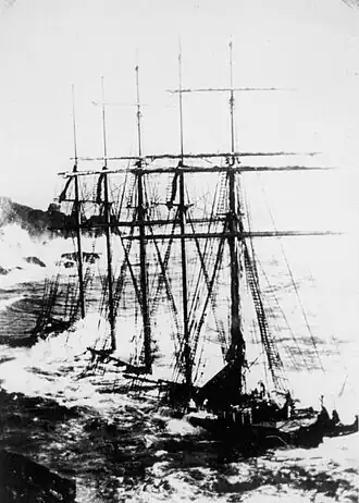 On 9 February 1923,[6] during her maiden voyage from Kiel Germany to Barry, Glamorgan, Wales,[3][7] Adolf Vinnen was driven ashore at Bass Point, Cornwall, United Kingdom in a gale. The Lizard lifeboat attended the ship,[6] Her crew of 24 was rescued by breeches buoy from the cliffs above the wreck. Adolf Vinnen was the last large sailing ship wrecked in the Lizard area.[2] The wreck lies in 12 metres (39 ft) of water.[1]