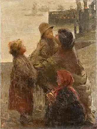 Visconti was born in Pura, Canton Ticino. Orphan of father by the age of 16, he enrolled at the Brera Academy of Fine Arts when he was 18,[1] where he studied with Luigi Bisi, and made his debut in 1873 as a perspective painter. Attracted by the work of the Milanese Scapigliatura movement, he was one of the first members of the Famiglia Artistica Milanese. He completed his studies under the guidance of the history painter Stefano Ussi, which brought him into contact with the Tuscan art scene. On his return to Milan, he took part unfailingly in the major national exhibitions, attracting the attention of critics in 1881 with a work on a historical subject. It was in 1883 that he produced the first of his still lifes, which were to earn him a considerable reputation in the 1890s. A portrait of his in an outdoor setting won the prestigious Prince Umberto Prize in 1891, thus launching a renewal of the traditional approach to this genre through the influence of Cesare Tallone's work and the first photographic models. The period between 1907 and 1909 saw a stay in Patagonia, where the artist painted canvases capturing various aspects of the life of the indigenous population. His tree Works Testa di indio della Terra del Fuoco, I funghi, Tordi are in the permanent collection of the Pinacoteca Cantonale Giovanni Züst in Rancate, while two other works, Uva nera and Ritratto di donna, are at the Museo Cantonale d'Arte of Lugano.[2]