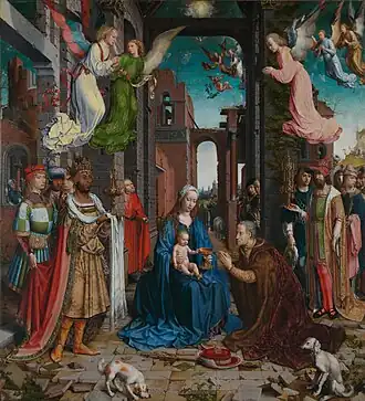 The Adoration of the Kings is a large oil-on-oak painting by Jan Gossaert (born Jean Gossart, also known as Jan Mabuse), dated to 1510–15, depicting the Adoration of the Magi. Although Gossaert's name is signed on the border of Balthazar's richly embroidered headdress, and on a collar worn by Balthazar's turbaned attendant, the painting was occasionally attributed to Albrecht Dürer in the 17th and 18th centuries. In 2010, Ainsworth suggested that the work was a collaboration between Gossaert and Gerard David.
