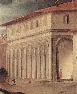 It was commissioned to be inserted into the room's wooden paneling, alongside works by other artists, in the manner of the slightly earlier Marriage Chamber in Florence's Palazzo Borgherini, to which Pontormo also contributed. The other works in the antechamber were Franciabigio's Bathsheba Bathing (Gemäldegalerie, Dresden) and Bacchiacca's Legend of the Dead King's Son (Gemäldegalerie, Dresden) and Baptism of Christ (Gemäldegalerie, Berlin), all surmounted by a larger work, Andrea del Sarto's Saint John the Baptist as a Boy (Galleria Palatina, Florence).[2]